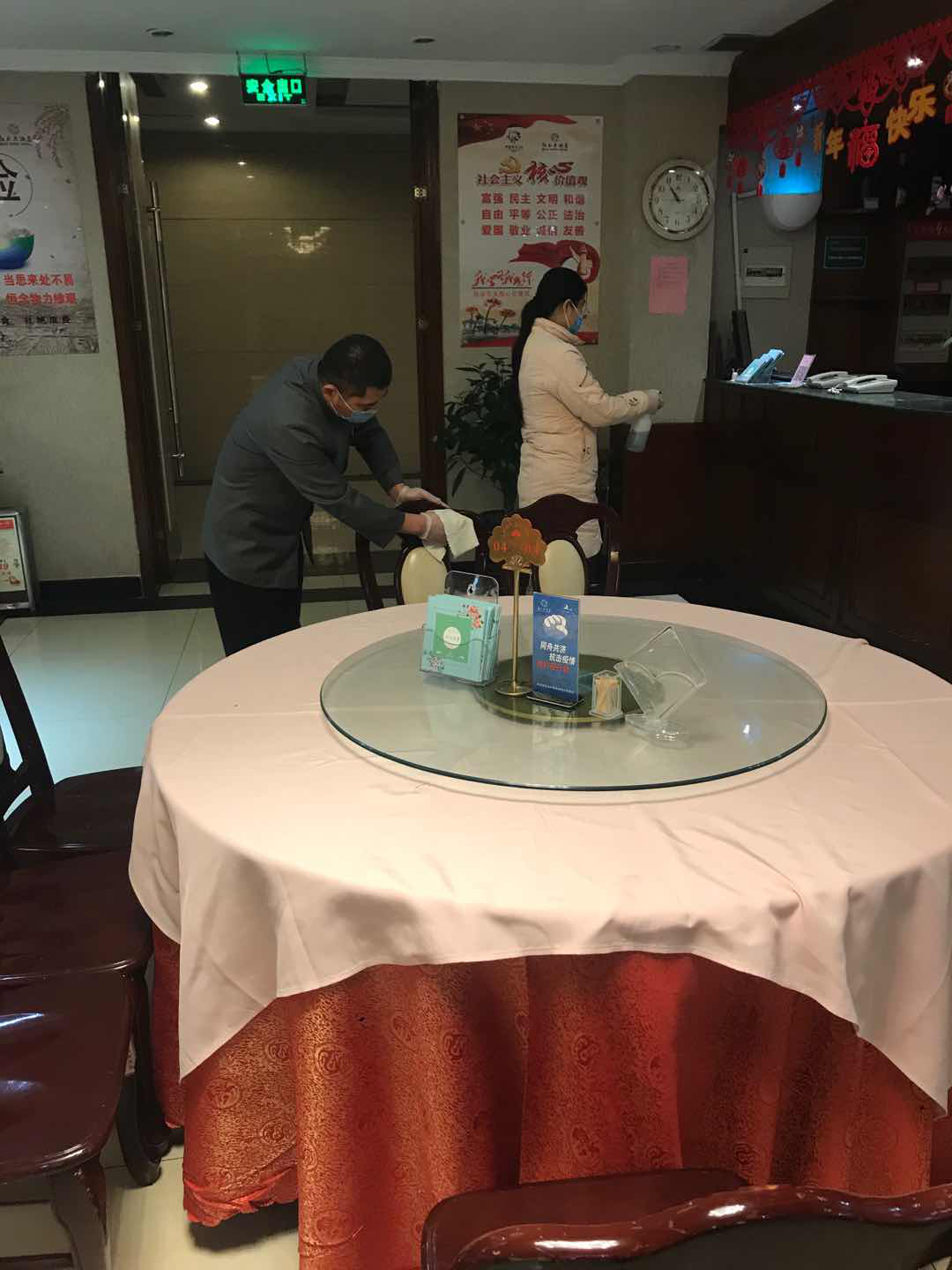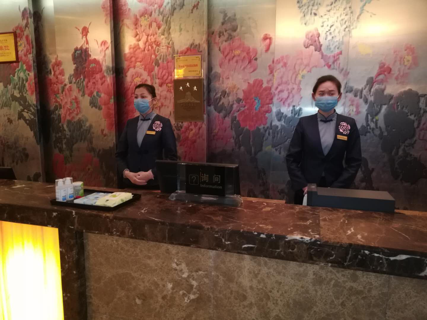 總臺(tái)設(shè)置一米間距隔離欄和提示牌;配備免洗手液、消毒濕巾、抽紙、口罩供客人免費(fèi)使用;總臺(tái)接待員工帶醫(yī)用一次性口罩、手套防護(hù),并配備有客用手消毒液、抑菌手紙。