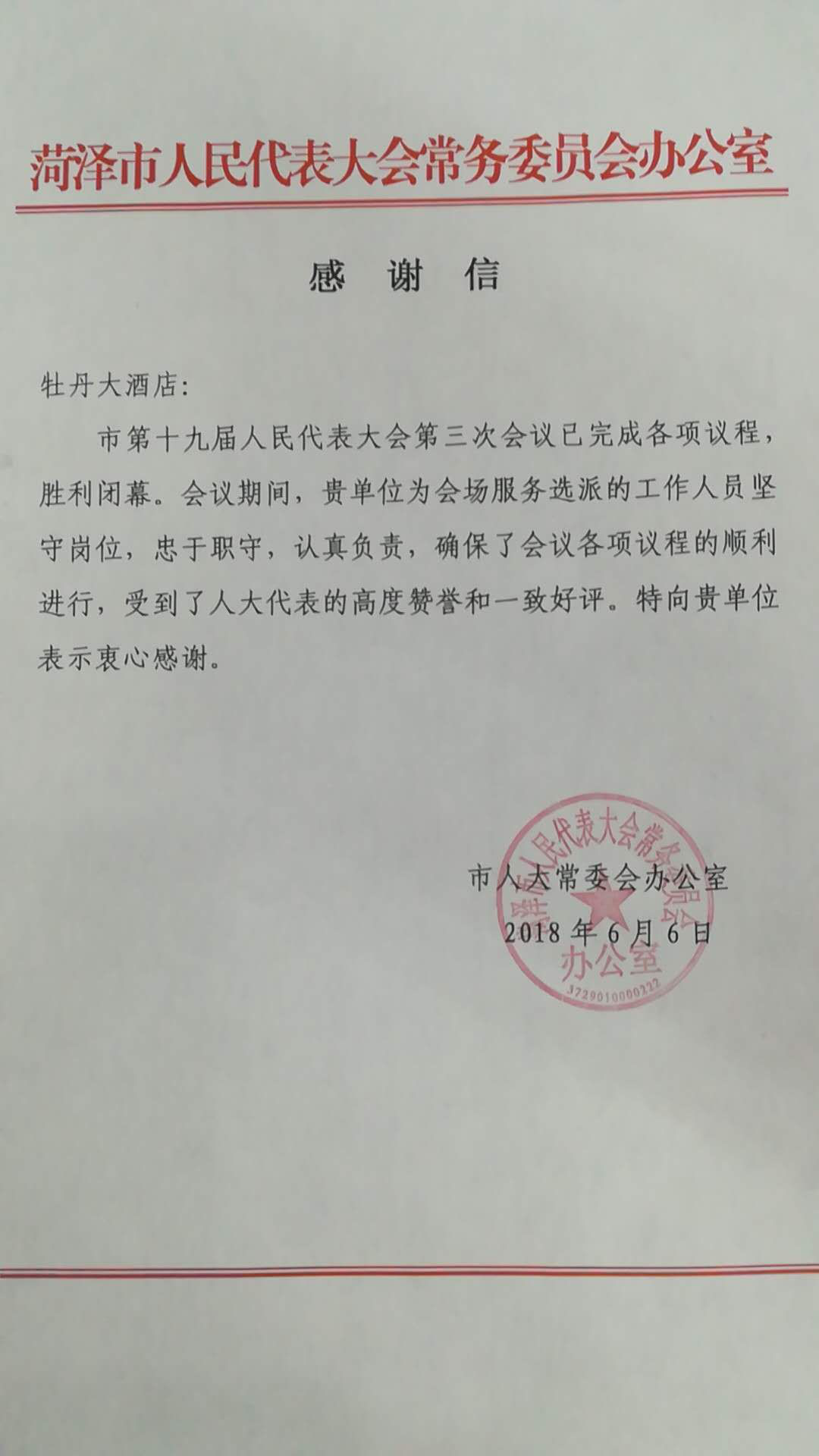 2018年6月4日至6日酒店接待了菏澤市第十九屆人大會第三次會議。會議期間,牡丹大酒店全體員工秉承專業(yè)的職業(yè)素養(yǎng),精湛的服務(wù)技能、忘我的工作精神,做好人大會服務(wù)工作。接待工作中,管理人員親自到一線進行現(xiàn)場督導(dǎo),員工們都各司其職。
