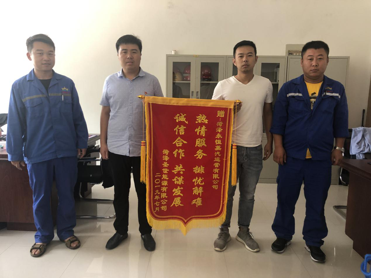 7月3日,菏澤圣世能源有限公司一行三人,專程來到菏澤永恒蒸汽運營有限公司,將一面印有“熱情服務(wù) 排憂解難 誠信合作 共謀發(fā)展”的錦旗送到公司工作人員手中,并表達(dá)感謝之情。